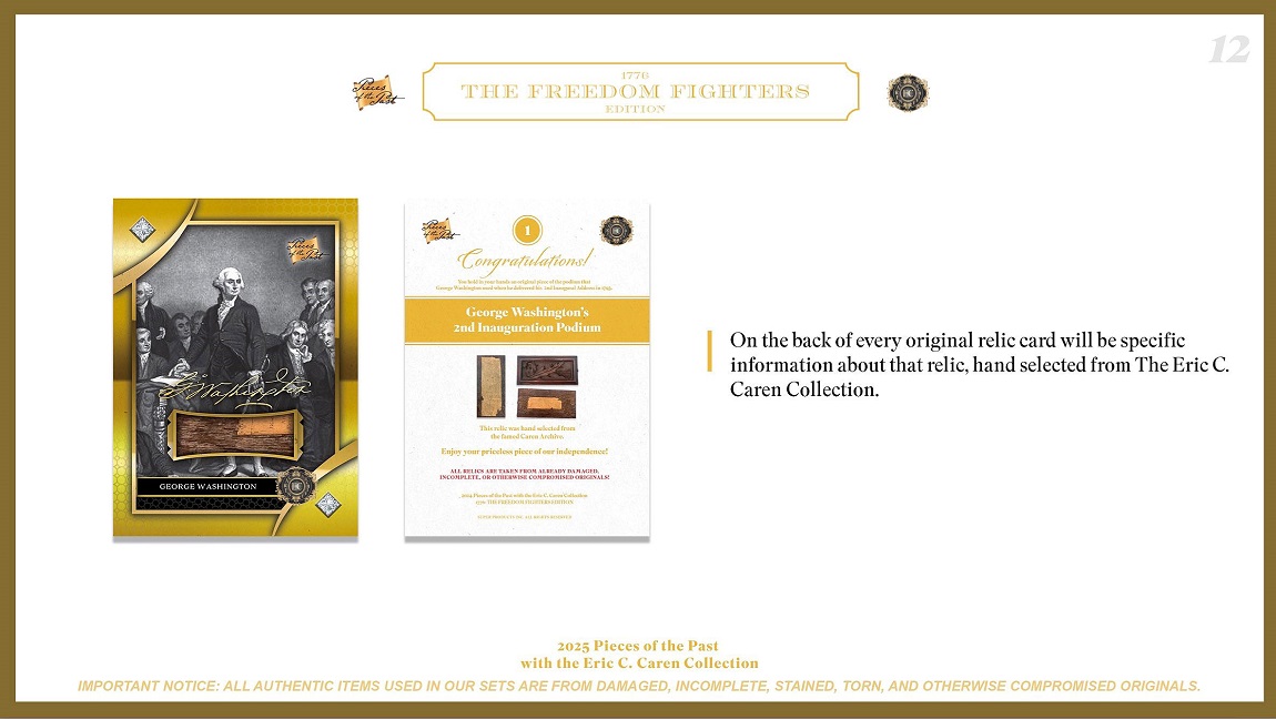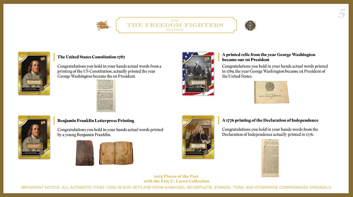 This set will combine the high-end relics found from the inaugural release of 2025 Pieces of the Past 1776: The Freedom Fighters Edition with the updated inclusion for these high-end military relic cards!