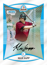 明日之星卡-平均每包4張,110張 Ø Bowman明日之星卡-非大聯盟的明日之星,穿著自己的MLB制服伴隨著First Bowman Card的字樣出現-編號BP1-BP110-平均每包2張 另有下列平行卡 ² 紅版平行卡-Hobby獨賣!限量1 OF 1 ² 橘版平行卡-限量250 ² 藍版平行卡-限量500 ² 金版平行卡-比例1:3包 Ø Bowman Chrome 明日之星-所有的110位明日之星搭配First Bowman Chrome Card的字樣一同出現,這些 Bowman Chrome卡只會在Bowman的卡組裡,編號BCP1-BCP110。2008 Bowman Chrome將會從編號BCP136開始-平均每包2張